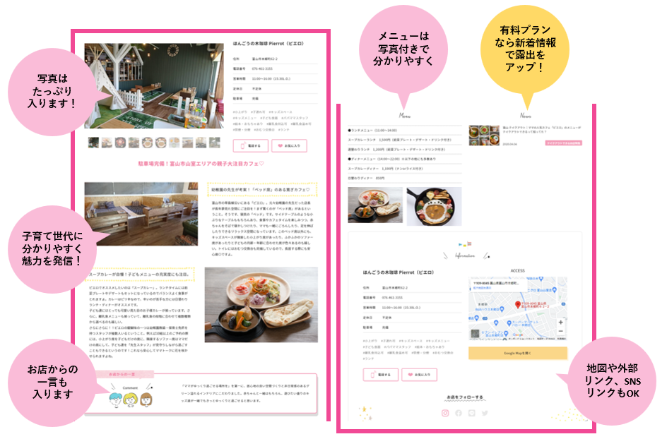 など、「子育て世代に来店してほしい」想いがあり、子連れで来店しやすい環境やサービス、特長をお持ちのお店様ならママスキーに掲載いただけます。